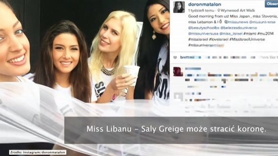 Miss Libanu Saly Greige może stracić koronę. Fala krytyki spadła na piękność, po tym jak w sieci pojawiło się jej selfie z Miss Izraela. Oba kraje od wielu lat toczą ze sobą wojnę, a Libańczyków obowiązuje absolutny zakaz kontaktu z Żydami. Zdjęcie opublikowała Miss Izraela - Doron Matalon. Saly Greige skomentowała sprawę, pisząc: "Już od pierwszego dnia uważałam na to, by nie mieć ani jednego wspólnego zdjęcia z Miss Izraela, choć ta ciągle próbowała je zrobić".