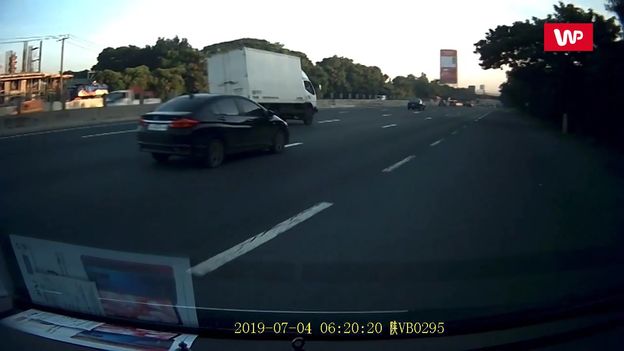 Na autostradzie w Filipinach doszło do niebezpiecznego zdarzenia. Biała ciężarówka musiała hamować by uniknąć kolizji z czarnym samochodem, który zajechał jej drogę. Wpadła jednak w poślizg i zaczęła bujać się w obie strony. Mało brakowało, a wywróciłaby się na środku drogi. Na szczęście kierowcy udało się opanować auto i uniknąć wypadku, który mógł być naprawdę tragiczny w skutkach.