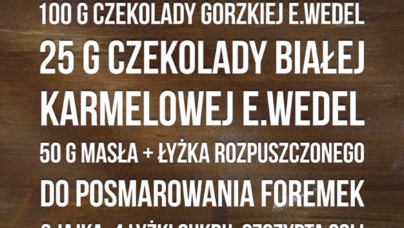 Składniki: 100 g czekolady gorzkiej E.WEDEL, czekolada karmelowa E.WEDEL, 50 g masła + łyżka do posmarowania foremek, 2 jaja, 4 łyżki cukru, szczypta soli, łyżka mąki + druga do posypania foremek.