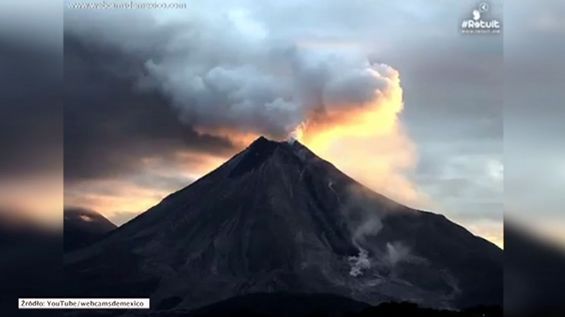 Erupcja wulkanu Colima na tle wschodu słońca