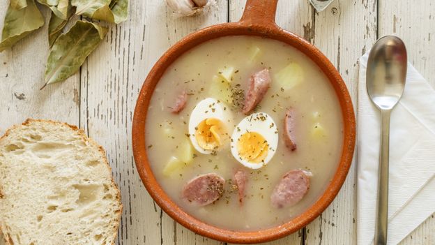 Żurek to zakwaszana mączna zupa. Swój charakterystyczny kwaśny smak zawdzięcza temu, że jest przyrządzana na zakwasie z mąki razowej. W zależności od rejonu kraju, istnieją różne receptury przyrządzania tej tradycyjnej zupy. Różnica tkwi np. w mięsie, na którym gotuje się wywar na zupę. W niektórych regionach używa się do tego szynki wieprzowej, ale najbardziej popularnym mięsem jest surowa biała kiełbasa. Zobacz film.