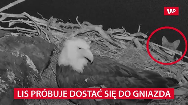 Ciekawą sytuację zarejestrowała kamera umieszczona przy gnieździe jastrzębia - bielika amerykańskiego. Na nagraniu widać samicę bielika opiekującą się jajami. W pewnym momencie w oku kamery pojawia się… lis. Ten mały, przebiegły łowca sądził, że w gnieździe mogą być już pisklęta, chociaż jaja to też nie lada gratka.