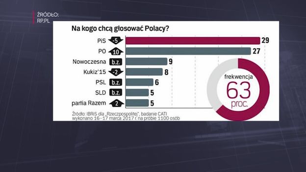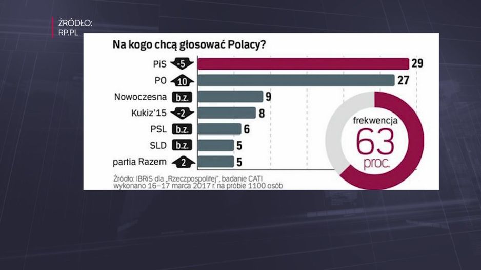 Maleje przewaga PiS nad PO. W najnowszym sondażu IBRIS dla "Rzeczpospolitej", na partię Jarosława Kaczyńskiego chce głosować 29 procent badanych (spadek aż o 5 punktów procentowych), a na PO 27 procent, co daje wzrost aż o 10 pp. Według sondażu CBOS z zeszłego tygodnia spadają też notowania prezydenta Dudy.