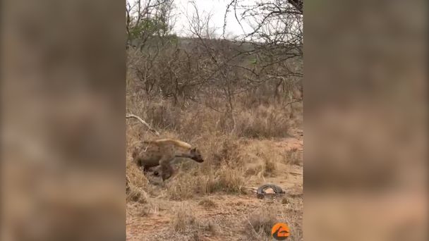 Afrykański pyton skalny przymierzał się do zjedzenia upolowanego ”obiadu”. Na impalę ochotę miała jednak również pewna hiena. Sprawdzając czujność węża, powoli i niepewnie skradała się, by ukraść mu pożywienie. Choć pyton próbował uratować swój posiłek, w starciu z hieną nie miał szans. Musiał obejść się smakiem. Całe zdarzenie uwiecznił na wideo jeden ze strażników z Narodowego Parku Krugera w RPA.