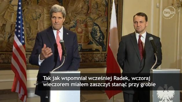 Odwiedzający Polskę sekretarz stanu USA nie uniknął pomyłki podczas wspólnej konferencji prasowej z ministrem spraw zagranicznych Radosławem Sikorskim. John Kerry, odnosząc się do wizyty na cmentarzu, na którym pochowano Tadeusza Mazowieckiego, powiedział, że złożył wieniec na grobie byłego ministra spraw zagranicznych (former foreign minister). Tłumacz symultaniczny poprawił ten błąd w swoim przekładzie.